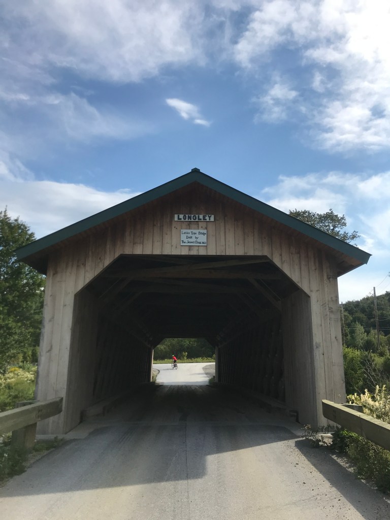 We zipped down Longley Bridge Road and into Montgomery. After a bucolic stretch of more views from the bottom, we were greeted by the Longley Bridge proper. One thing I didn’t touch on in the Montgomery entry was the proliferation of covered bridges in the town. There are six in the town limits, and one crossing the town line with Enosburgh, making it “the record-holder for most covered bridges in New England and the United States at large.” As recently as the 1940’s there were 13 in town! This one is a beautiful town lattice that was recently rebuilt with new trusses in 2016. From there we enjoyed some speedy pavement and sunshine on Route 118, a road I remember well from my college days driving from Burlington up to Jay to ski. We re-entered Enosburgh and I didn’t get a picture, but you can always tell when you’re in that town due to their bovine road signs. If it weren’t for Brad’s knowledge of a shortcut, we’d have gone all the way into East Berkshire, but the Class 4 he routed onto was a ton of fun. We climbed up and over some rough stuff: a good challenge of loose “baby heads“, cobbles, bedrock and muddy puddles. We made it through, again greeted by another smooth ride. This time it was the double track of the Missisquoi Valley Rail Trail that we glided down into Richford’s downtown. We stopped at a gas station to rest, have a snack and restock before we made a run west up along the border.