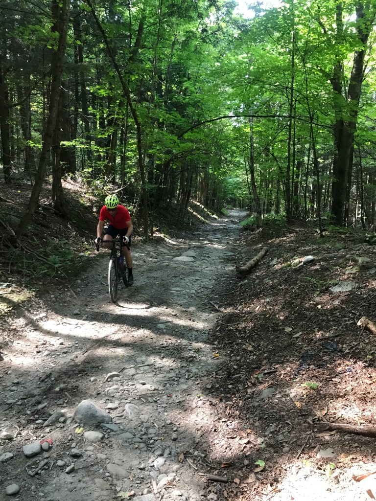So the next morning, we met in East Fairfield under ominous skies and blustery winds. Things got off to an inauspicious start when Brad’s chain fell right off in the parking lot. However, it was quickly fixed and the riding improved from there: we headed north out of town on Egypt Road (which has both stellar riding and a stellar story behind the name). At this point, I had made one request of Brad to deviate from his planned route so we could hit Bakersfield. We passed up the fun technical Class 4 of Mitchell Road in favor of the Class 3.5 of County Road. We had an easy cruise down to Route 108, turning east to begin working up and over towards Montgomery. We’d already checked that one off the list, but the views made it a must.