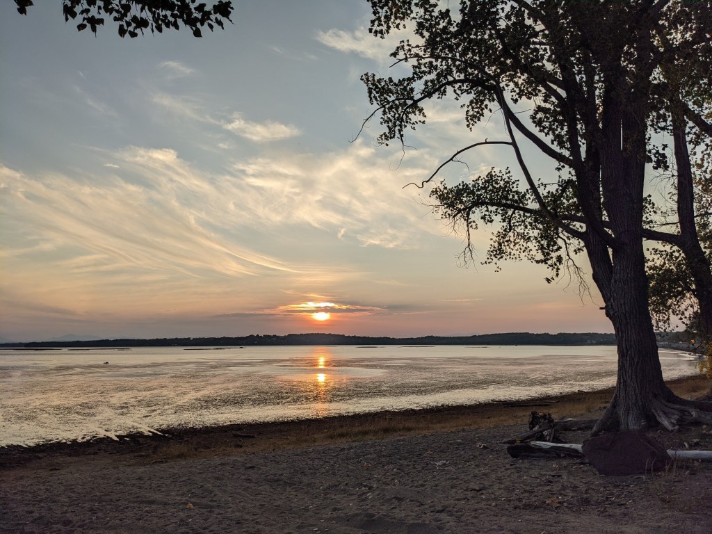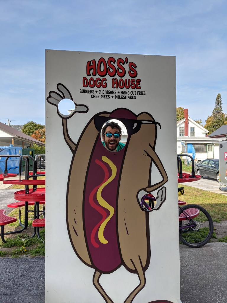 Right away it was apparent that unfortunately Maddie’s bike was giving her fits. After navigating the fast stretch of Route 2 connecting the sand bar/causeway area to the mainland, we stopped to assess. We was having to tire rub and needing to exert much more effort than needed. After a few attempted fixes, a tip from Cameron seemed to help. Maddie’s plan all along was to ride her own ride at her own pace so she assured us all she’d be fine and to ride on ahead. She’d be in touch if she needed help and would turn back when she felt like it. We rode together for a bit more, but soon drifted apart. She had her book and paints with her too and she’d surely have a lovely day no mater how many miles she covered (but don’t fret, this isn’t the last we’ll hear of Maddie). For all of us, getting off Route 2 and into the back roads of Milton and Georgia was a good change of pace. In between some an area of nature preserves that mix with private roads with (presumably) fancy houses on the coastline and the central area of more exurban/agricultural town center, Milton has some beautiful rolling gravel roads. We eventually dropped down onto the mellow Georgia Shore Road which placed us right next to many small seasonal camps along the water. We had light traffic and the first of many fantastic shoreline stretches. Eventually, we reached Saint Albans town but needed to also tick off Saint Albans City. Vermont has nine cities and many of them came about because villages within towns incorporated as cities throughout the years. This was the case for Saint Albans as the city broke away from the town in 1902. The city is only 2 square miles which made finding some dirt to ride tricky. But after a brief stop at Hoss’s Dogg House, home of what some argue is the largest and cheapest creemee in the state, we found a strip of gravel in Houghton Park where we took our first full rest.