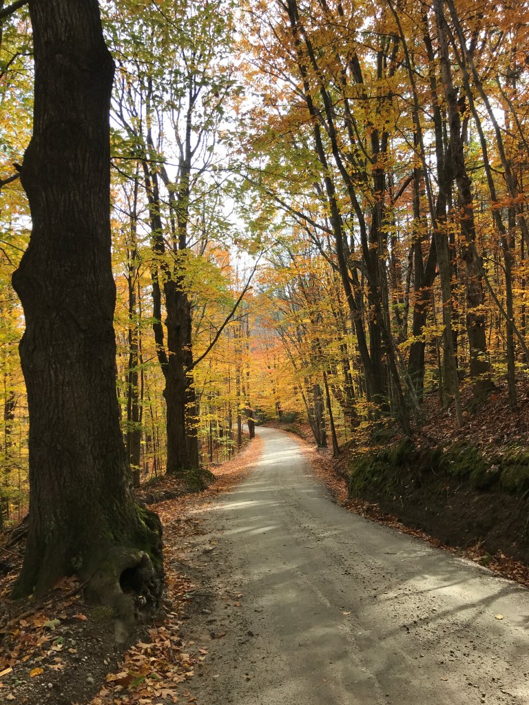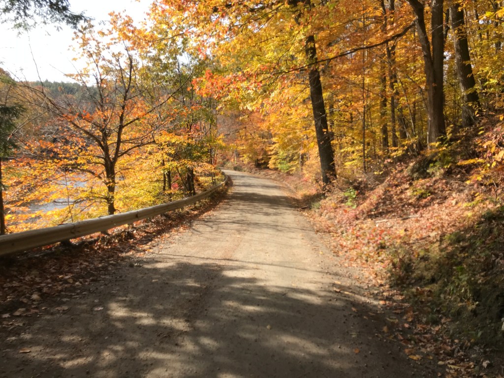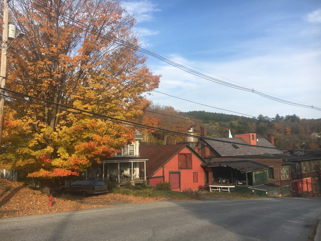 We took a little bit of time to soak it all in, but after our 2-hour drive and with daylight hard to come by, we needed to begin. The cruise down Meeting house Road to Route 103 afforded us some fine views of old houses and a little time to settle in. However, quickly enough we were onto the generous shoulder of the state highway. Even with the space, I was not looking to be on there for too long. One of the more curious sights we saw was one of the locations for the Vermont Country Store. The business began by doing a mail order, but the founding family (the Ortons) also quickly bought an historic store in Weston and began selling wares from that as well. The store was an old general store and apparently “has the distinction being of America’s first restored and fully operational country store and has been placed on the National Register of Historic Places.” The store in Rockingham is not quite so historic. It appears to have been purpose-built and has a grist mill and pond, but the pond is below the mill, so there’s no way to power the mill. This and other seemingly out of place items like a covered bridge over a ditch, try to make it look historic and “quaint” but it all seems off. Especially having come from the actual historic center of a town, all this packaging feels way more Hallmark Christmas Special, than what some consider to be “real” Vermont. Either way, we were happy to get back on some side roads and enjoy the slower pace of things. We passed over two covered bridges, by so many barns and also a few little clusters of houses that were once micro-villages in town. Rockingham actually has a number of villages, including Bellow’s Falls and Saxton’s River. These are now the main downtowns, but it seems like the center of population jumped around as farming, industry, railroads, and other economic forces ebbed and flowed thought town. Sadly, a 1908 fire burned much of the original settlement around the meeting house, taking several houses, a store and hotel, ultimately ensuring “Old Town” was no longer a center of activity. In order to tick off the town of Grafton, we took a small detour. When planning routes, for the life of me I couldn’t easily link in Grafton with many other towns, so this unfortunately became a clipping the corner situation. However, Eastman Road was very pleasant, running next to the babbling Hall Brook and we even got some Class IV between Richards Road and Horseshoe Farm Road. Maddie’s old TREK 420 absorbed all the bumps from rocks hidden under the leaves and soon enough we were done with our detour and ready the enter Chester.