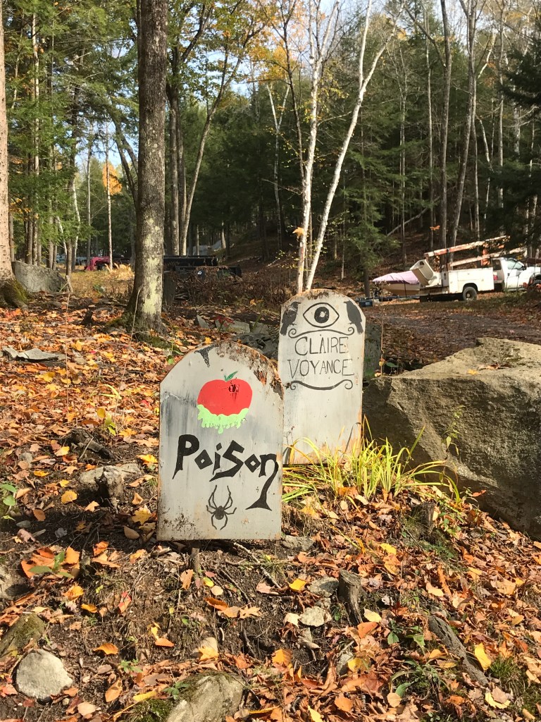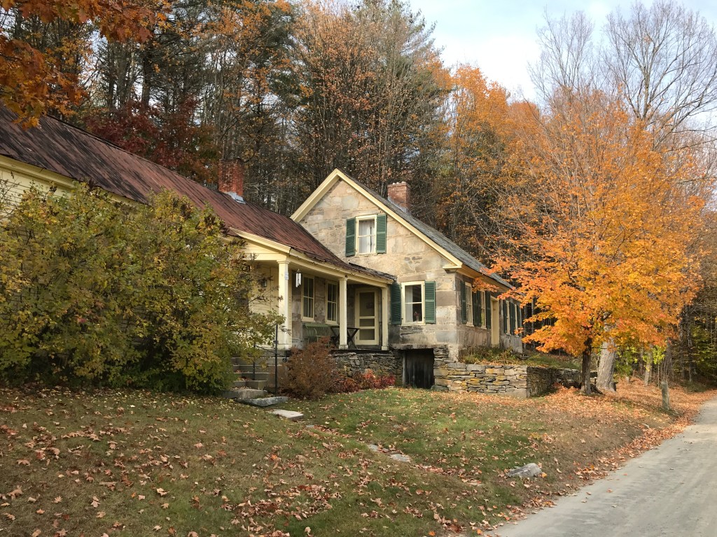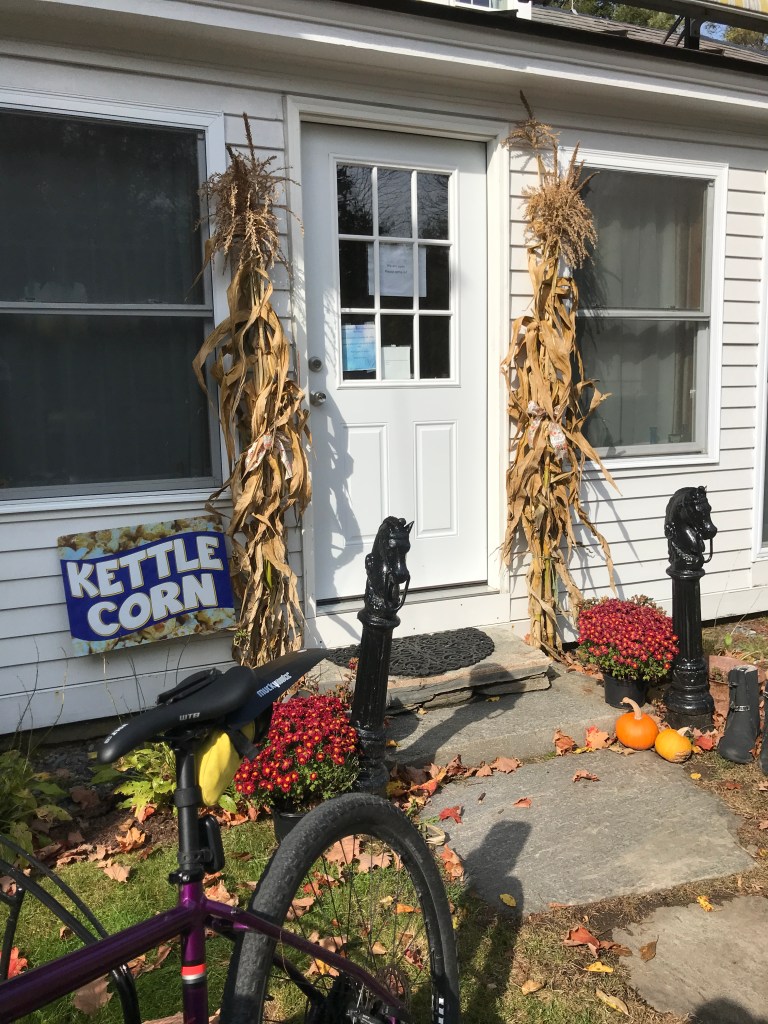 The road leading into Chester continued the theme of barns and bridges and we noticed a lot more work in stone. Beyond the stone houses that are spread throughout this valley (like the one at the top of this post) there were small stone posts that line much of the road. After some moderately exhaustive research, I’m not too much closer to knowing what they were for. My best guess is hitching posts or fence posts. They seem too numerous and spread out to be hitching posts, but too expensive to be fence posts. Anyway, if anyone knows, be in touch. Soon enough we were in Chester Depot. There’s a more classic downtown of Chester with what many people would consider the classic New England row of shops and a small strip of public green. It’s actually been recognized as an Historic District. However, we took a pitstop at the Chester railway station. It’s used mainly now for a tourist train, but there was clearly a lot of industry in the area as evidenced by the many stores and industrial buildings huddling close to the tracks. We looped into yet a slightly different part of Chester, this one known as Stone Village. It’s actually another Historic District, known for mainly for its concentration of buildings that were built using what is apparently called the snecked ashlar technique. Riding by and marveling at all the beautiful stone work, we almost missed the kettle corn sign. Luckily Maddie noticed at the last second, so we turned around and bought a bag from a nice man who sets up on weekends as his retirement job. We resisted munching right away and pushed on. By the way, if Vermont stones are your thing, there a whole Vermont Stone Trail! But that journey will have to wait until this 251 business is taken care of. We finally had to take leave of the valley and began the climb up Trebo Road, seeing a few more stone houses, as well as some silly Halloween decoration gravestones (made of wood!). We missed the Snell Road turn off thanks to a fun downhill and a kind of tricky sign (but mostly just the fun downhill). So we had to backtrack up, only to finish the down then continue up Chandler Road after crossing Route 10. We were closing in on the tiny hamlet of Baltimore, the second smallest incorporated town in Vermont!