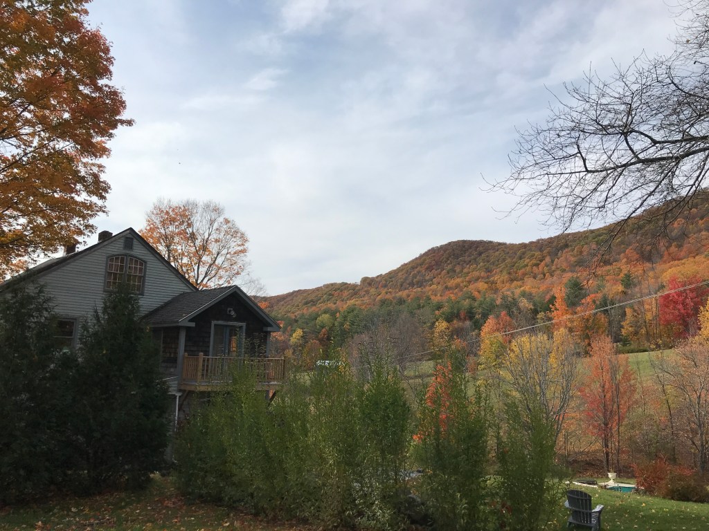 The transition from fall to stick season had continued its relentless march southwards and with peak foliage already nearing the Massachusetts border, Maddie and I decided to get a ride in. I’d been keeping some of the southern routes in reserve for times like this, figuring there would be a day with sun and moderate temperatures. Plus it’s always fun to take a good long journey on a crisp autumn day. And journey we did. We began by setting course down I-89 and I-91 for the historic village around the Rockingham Meeting House. It’s on the top of a small knoll and surrounded by sweeping views of the surrounding hills and valley of the Williams River. In the year 2000 it was listed on the National Register of Historic Places and deserves the recognition: it’s stunning and needs to be seen in person to be fully appreciated. As a nearby historic marker says: