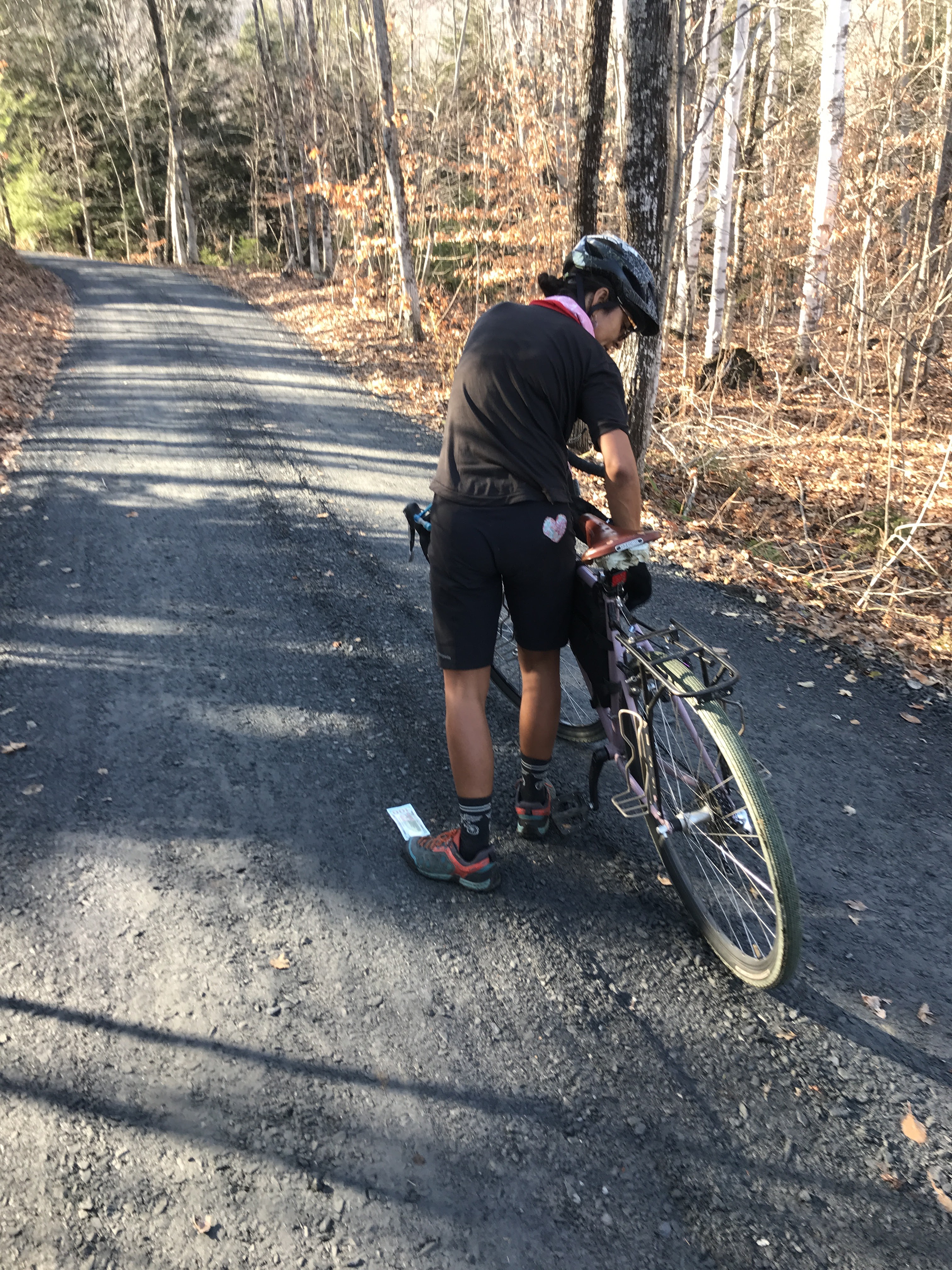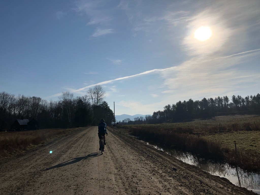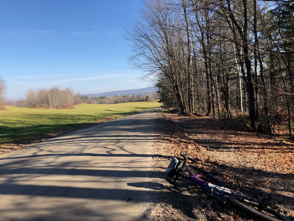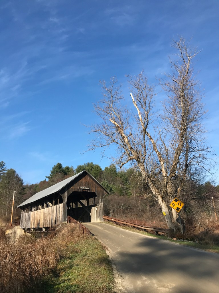 I’d kind of thought the Dirt 251 project had been put on hold until next spring. Temperatures were falling, Maddie and I had pretty much prepared the house for winter, and we got very decent snow! But as quickly as the inches piled up, they disappeared, fully succumbing to a streak of over 60° and sunny days. So it didn’t take much convincing to get me back out there. Because their route had somewhat fallen through, I also managed to get some partners for the ride too: Brad and Rafa. We all rendezvoused at the Montpelier Public Pool which has sadly been shuttered during COVID. I had chosen this route mainly for its easy access from home, but I’ve always had a soft spot for Montpelier too. It’s where Maddie was living when we first started dating, and it’s just a fun, historic, quirky, heartfelt, overgrown-town of a city. The weather still had a bit of a nip in the air, as the river valleys were still stubbornly holding on to their cloud cover (which often happens in fall). But wrapped in warm layers we were hoping to soon shed, we began our trip. The route I’d planned included some of the mountain bike trails accessed just on the other side of the river from the parking lot. Sadly, they’d already been closed for the season, so we needed to turn around and take the alternate route: North Street. On our way out to the main road though, Brad was battling his front derailleur. It had been sneakily getting worse and he was now stuck in the little ring. He tried valiantly to fix it with help and hints from me and Rafa, but he decided to throw in the towel and with a quick goodbye, wished us well. Luckily, he was able to get a ride in that day on his road bike, but he was sorely missed. So onwards Rafa and I rode to take on North Street. It wasn’t my first date with this steep street: Maddie and I had taken it on during a two–day tour last year. It took quite the effort then, so I was glad to not have loaded panniers and a heavy steel frame underneath me. We pushed up and up, eventually breaking into the sunshine. We cruised along and down the rollers of East Montpelier and made our way to Route 2 crossing the Coburn Covered Bridge which spans the main branch of the Winooski River.