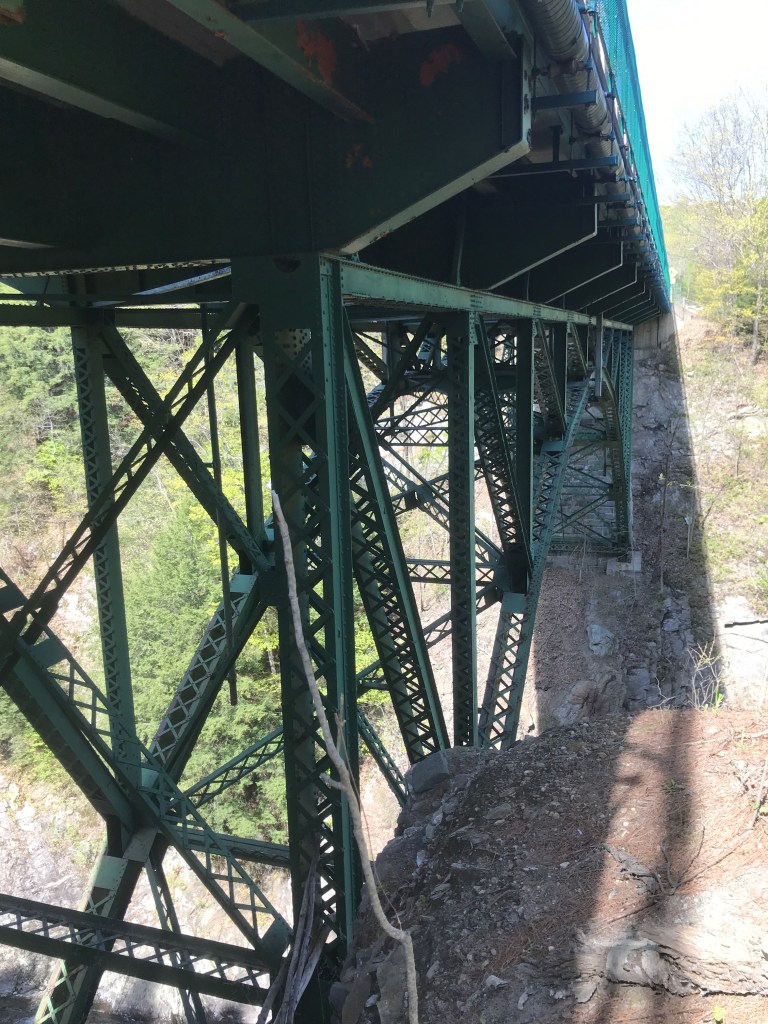 After the first of a series of Class 4’s today, I bombed down the very steep drop back to the Ottauquechee River. I arrived into the land of the Quechee Club. The main area of the resort was abuzz with pickleball, tennis, golf and there even seemed to be folks congregating around the base of the ski lift. (Yes, they have a small ski hill there with 508 feet of vertical drop!!!) I thought about trying to poach the small bridge and take the back way into town, but I thought better of it. I looped along the river coming into the picturesque village of Quechee. Hit hard by Irene, the village is one of five within the town of Hartford: Hartford, Quechee, West Hartford, White River Junction and Wilder. White River Junction is much bigger, but Quechee certainly has a huge draw with its compact buildings huddled along with river, with the Simon Pierce glass blowing, restaurant, etc. complex at the center. I stopped at Quechee Falls Park which is essentially the basement of a building that formerly stood on the site. I ate a few snacks and admired the view, including a sweet-looking rope swing that was hung up under the bridge. I then decided to call a small audible and head over to Quechee Gorge on Route 4. The Gorge has been called “Vermont’s Grand Canyon” but I’d never been and since it would only add a couple of miles I tacked it on. It didn’t disappoint. The view was spectacular and I was surprised at how old and impressive the bridge was. It also sadly is a draw for people looking to end their own lives. A safety fence was installed in 2018 further bolstering protection measures that include a call box linked directly to counseling services. I enjoyed the view, but kept moving trying not to think about the desperate folks who had been drawn to that spot.