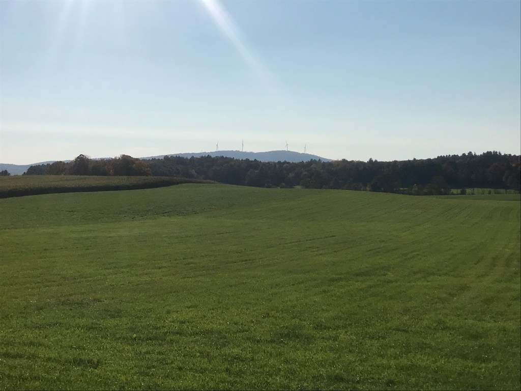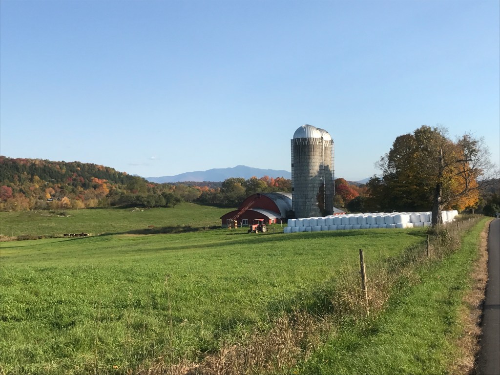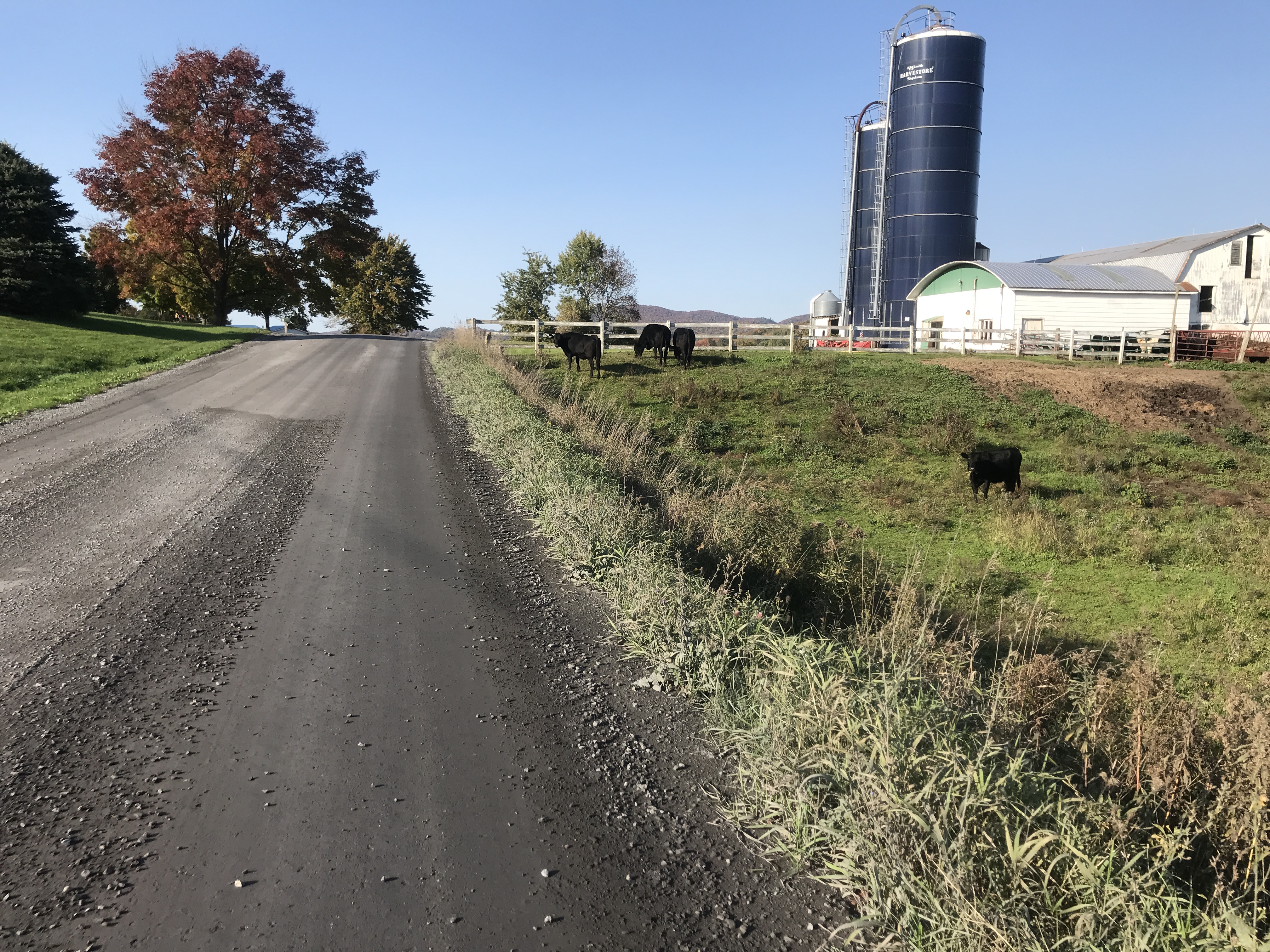 I continued north towards the center of Westford. Westford is a bit of a sleepy town, though there is occasionally drama and the odd Phish recording session. However, overall, I know it best for being a great town for riding. I also just discovered a neat school on Brookside Road since I normally ride it in the other direction. The Barn School with its distinctive windows is right down the road from Westford Elementary. I cruised onto the village green and paused briefly next to the Westford Country Store and Cafe. Foivos Kalimeris and Alexandra Argyropoulou opened the store in September 2020 (and a few months later became US citizens) and it’s been quite successful and a great place for a mid-ride snack. But I didn’t want to spoil my appetite so I pushed northeast on Cambridge Road over the Browns River Covered Bridge and on towards Fairfax. As I neared the border, I saw “Town Line Lane” though unlike the one from Ride 22, this one didn’t quite match the boundary and it’s fully in Westford. The countryside got a little more developed with some suburban-style development, but it’s still lovely scenery. I dropped down onto Route 104 for a few hundred yards before crossing the Lamoille River on a lovely truss bridge above Fairfax Falls. I turned onto Goose Pond Road and took it past River Berry Farm. This farm is a great place to score some strawberries when they’re in season. There wasn’t too much going on, but it did appear that there were some fall raspberries being harvested. I began climbing up out of the river valley and the settlements were similar: mostly wooded with a few cul-de-sacs and assorted developments. I passed the roads towards the village of Fairfax and its amazing pizza joint, Stone’s Throw (can you tell I was hungry?). The restaurant has since expanded to two other locations and even though it’s a bit pricey, it’s delicious. It was about this point in the ride where the landscape shifted a bit and I really felt like I was in Franklin County. The area is known for its agriculture and rolling hills (as seen extensively in Ride 11) and this was really meeting that reputation. I knew the feeling may not last, but passing a farmer raking hay made it really stick for the moment.