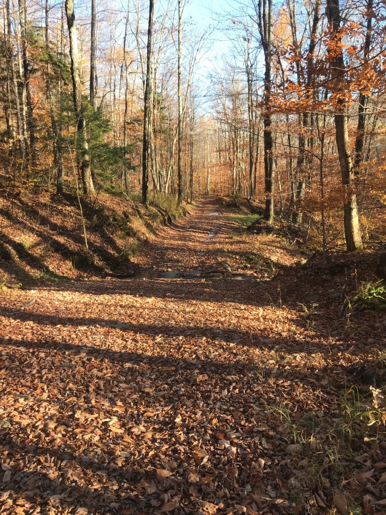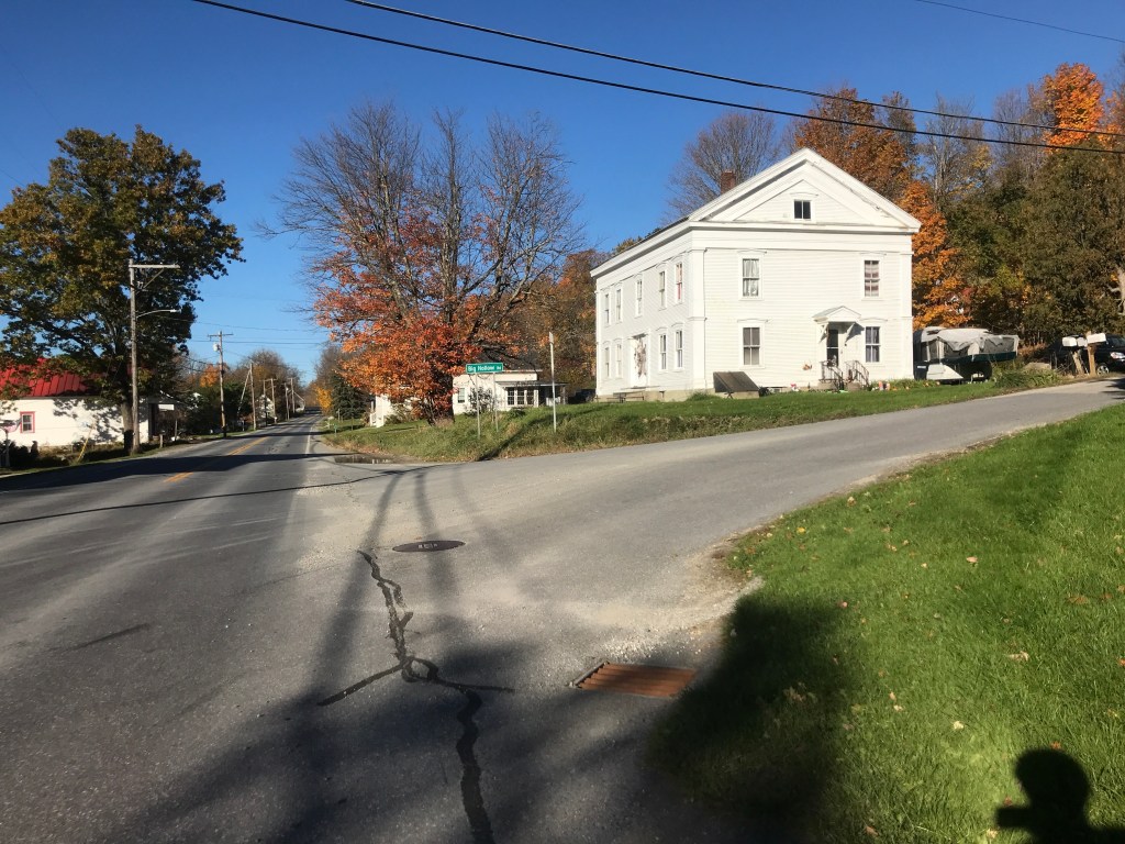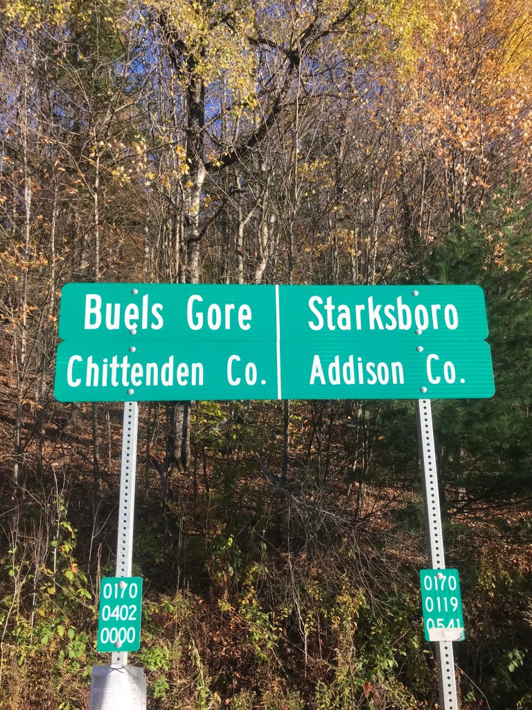 I eventually reached Route 17 and soon after was into Buels Gore. I thought it would be appropriate to go to my first gore of the project on Halloween weekend. However, these gores don’t have anything to do with blood and guts. The term actually came from the Old English word “gār” which meant spear. And this makes sense since gores are three-sided sections of land “left over when surveyors plotted boundary lines between neighboring towns but couldn’t quite make them meet.” According to this article, this particular gore got its name for Maj. Elias Buel who petitioned the legislature to grant him land for a town. But there wasn’t a parcel large enough, so he took it in three parcels: Coventry (a still existing town in the Northeast Kingdom), Coventry Leg (now absorbed into Newport) and Buels Gore. He originally wanted to name it Montzoar and eventually was granted the land, but the legislature backdated the transfer and he owed 8 years of taxes, which he could not afford. So a formal town was never incorporated and the residents there have existed in the unusual situation of having an administrator appointed by the governor as their town government embodied in a single person. The gore currently has 29 residents. This is down from 30 in 2010, but up from the 12 in 2000. It’s way below the highest population the gore had ever seen when it was home to 35,000 sheep, according to Esther Swift in her “Vermont Place-Names.” Living in the gore has its challenges: loud motorcycles in the summer, bad roads in the winter, but people tend to enjoy its solitude.
