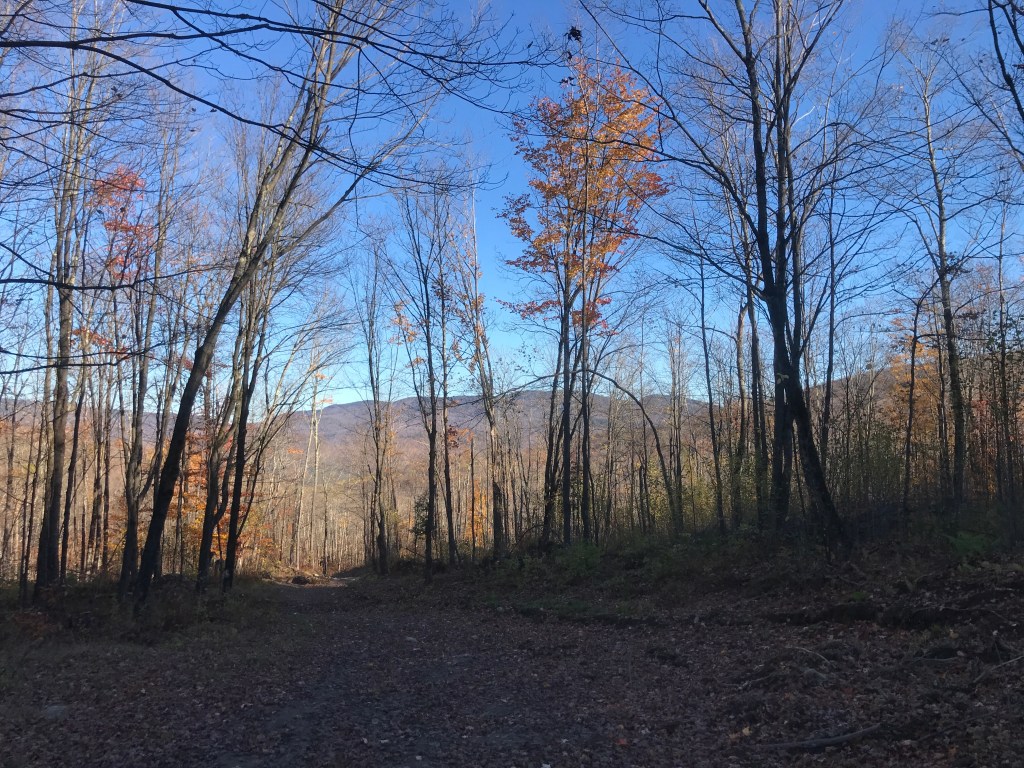 The town of Starksboro lies south of Hinesburg (from Ride 23) and is in the northeast corner of Addison County. It’s a somewhat sleepy town of about 1,700. It has a high number of farms, a world renowned rocking chair maker and one of its most famous residents was a stonemason. The aptronymously named David “Stoney” Mason lived in Starksboro for his whole life: 1931 to 2020. He specialized in dry laid stone walls, where no mortar is used and was an unofficial mayor to the town. I started my ride behind the town offices where there was (appropriately enough) a dry laid stone wall being built. I left my car in the “park and ride” zone and quickly headed out to begin the ride, knowing I’d be fighting the darkness on the back end. Right after I completed the first steep pitch of Big Hollow Road, I realized I had left my rear light in the car. So I zipped back and got to ride the hill again. Big Hollow Road is a back way north into Huntington. It slowly rises out of Starksboro village passing through a cleft in the rising hills that lead up toward the main spine of the Green Mountains and Camel’s Hump. I, however, was going to take an even more back way to go as directly as possible into Buels Gore. This meant I needed to take Brown Hill Road which climbs steeply up from Big Hollow. It’s maintained to various degrees throughout its length, but it’s certainly class 4 in the middle. The dead giveaway being that there’s a Brown Hill Road “West” and “East”, meaning you’re on your own in the middle. I had ridden much of this climb in May of last year, but turned off early only to be thwarted by a private road. There are a few houses, some rough camps and a maple sugaring operation. After a while, the climb mellows out and begins to traverse north along the ridge. The road got rougher here, but it was certainly passable. I wasn’t expecting to see much, but suddenly came across a pretty well built house by a large clearing with an SUV in front with Connecticut plates. I figured I’d made it over to “East” Brown Hill Road, but a few tenths of a mile later, I came upon a logging landing and some paths no SUV could handle, so they must come up from the Starksboro side. I paused at the landing and prepared to descend, knowing my forearms were about to get a workout, even as my legs got a break.