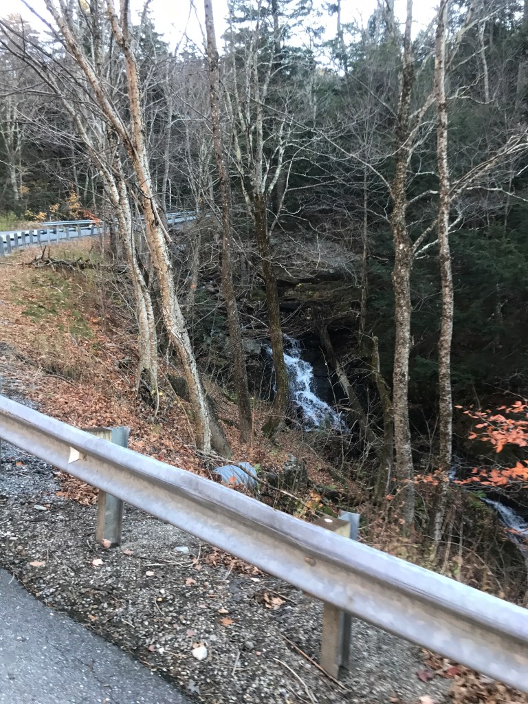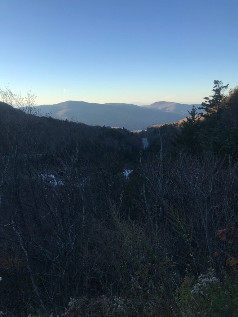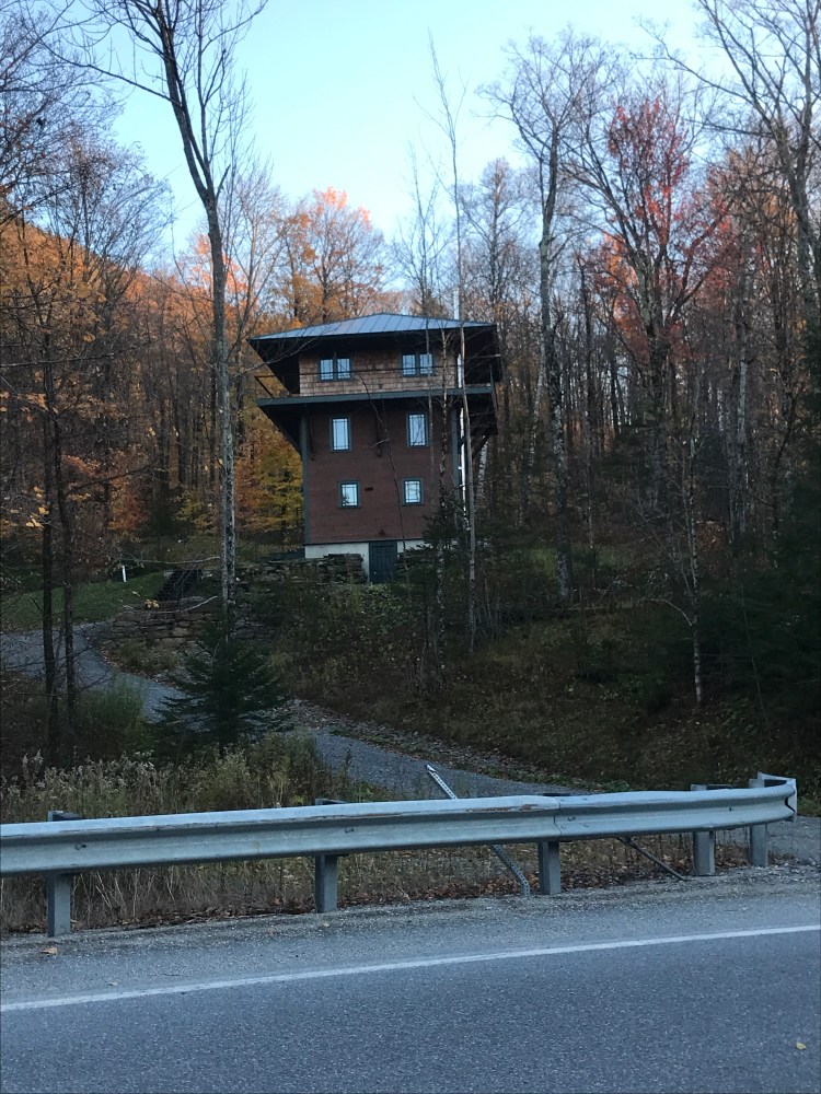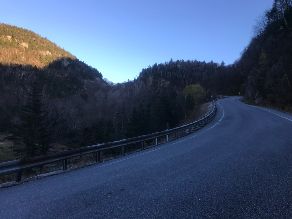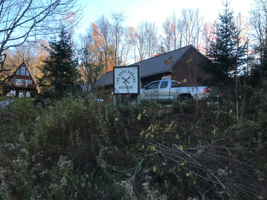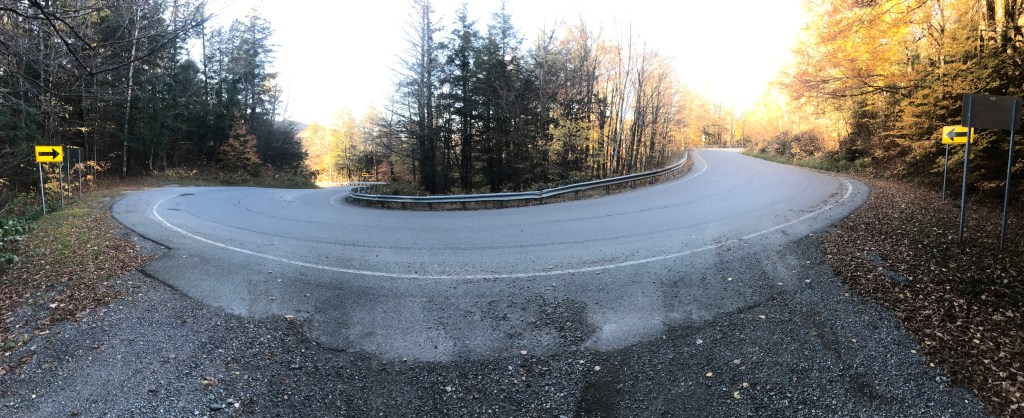 I began the long climb up to the top of the gap trying to balance the need to keep up with the sun, while also wanting to enjoy it slowly. It was actually my first time climbing App Gap and I knew I wouldn’t do it in anywhere close to the 11:36 that the “King of the Mountain” got. So I dropped into my lowest gear and began chugging. You quickly come to the only road-fronted business in the gore: a mechanic. “The Gore Garage” is a tiny one-person operation, and has good reviews. I continued climbing, sweeping back and forth around some real hairpin turns. The grade averages around 8%, but it has some sections that are relatively tame, but other punishing sections that briefly push over 20%. As I got higher, I kept my eyes peeled for moose and bear, as this used to be part of Maddie’s commute when she was working in the Mad River Valley and she saw both on her drives. Alas, I did not see any, but the bits of foliage that were still hanging on and the occasional waterfall were pleasant viewing. It was also fun to follow along on my progress thanks to the painted pavement that marked out the remaining kilometers and meters left to the top since this climb is the end of a section in the Green Mountain Stage Race. I continued pushing as the grade really picked up right next to the high, nameless pond just below the gap. I finally crested the top and took a brief respite looking out over the sticker-strewn guardrail through the golden glow and all the way out to the Adirondacks. I didn’t dawdle long though, as I still had to descend and the sun was really moving now. I did make a few stops doing down though, just like I had for the climb. I paused at one point to ride a short stretch of “Old Country Road” to ensure I’d been on some dirt in Buels Gore. I also stopped to admire one of the few houses you can see from the road. It’s a new build and more reminiscent of what you would find on the other side of the gap: the quirky and expensive homes of Fayston, Waitsfield and Warren. This side is in no immediate danger of getting as developed as parts of the Mad River Valley, since much of it falls within the Camels Hump State Forest, but I’m sure that development pressure exists. I continued down and back to the end of Main Road, where I began to climb up again, taking on the back side of what’s known locally as the “Baby Gap”. Not THAT Baby Gap, but the little sibling of App Gap.